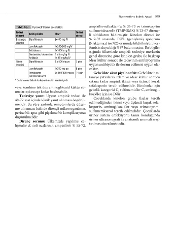 Tablo 85.1. Piyelonefrit tedavi seçenekleri. ampisilin-sulbaktam’a % 36-73 ve trimetoprim