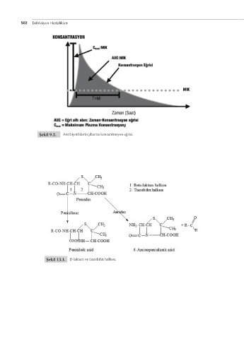 502 Enfeksiyon Hastalıkları Şekil 9.2. Antibiyotiklerin plazma konsantrasyon eğrisi. Şekil 13.1. -laktam ve tiazolidin halkası.