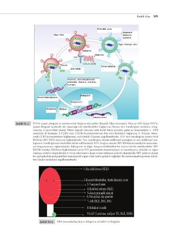 Şekil 31.1. HIV’in yaşam döngüsü ve antiretroviral ilaçların etki yerleri (Kaynak 2’den alınmıştır). Mevcut ARV ilaçlar HIV’in