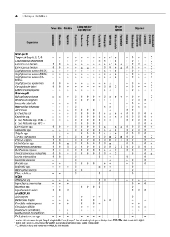 Organizma Doksisiklin Minosiklin Tigesiklin Daptomisin Vankomisin Teikoplanin Telavansin Fusidik Asid Trimetoprim TMP/SMX Nitrofurantoin Fosfomisin Rifampin Metronidazol Dalfopristin Kinopristin- Linezolid (Colistin) Kolistimetat