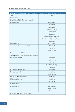 tablo 12. Hastalık modifiye edici (DMARD) ve immünsupresif/immünmodülatör ilaçlar