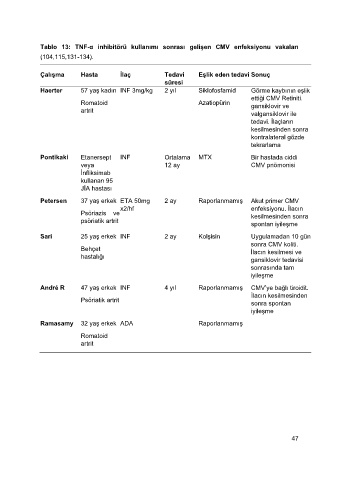 Tablo 13: TNF-α inhibitörü kullanımı sonrası gelişen CMV enfeksiyonu vakaları