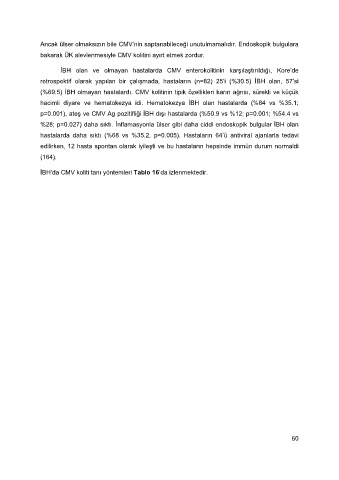 (%69.5) İBH olmayan hastalardı. CMV kolitinin tipik özellikleri karın ağrısı, sürekli ve küçük